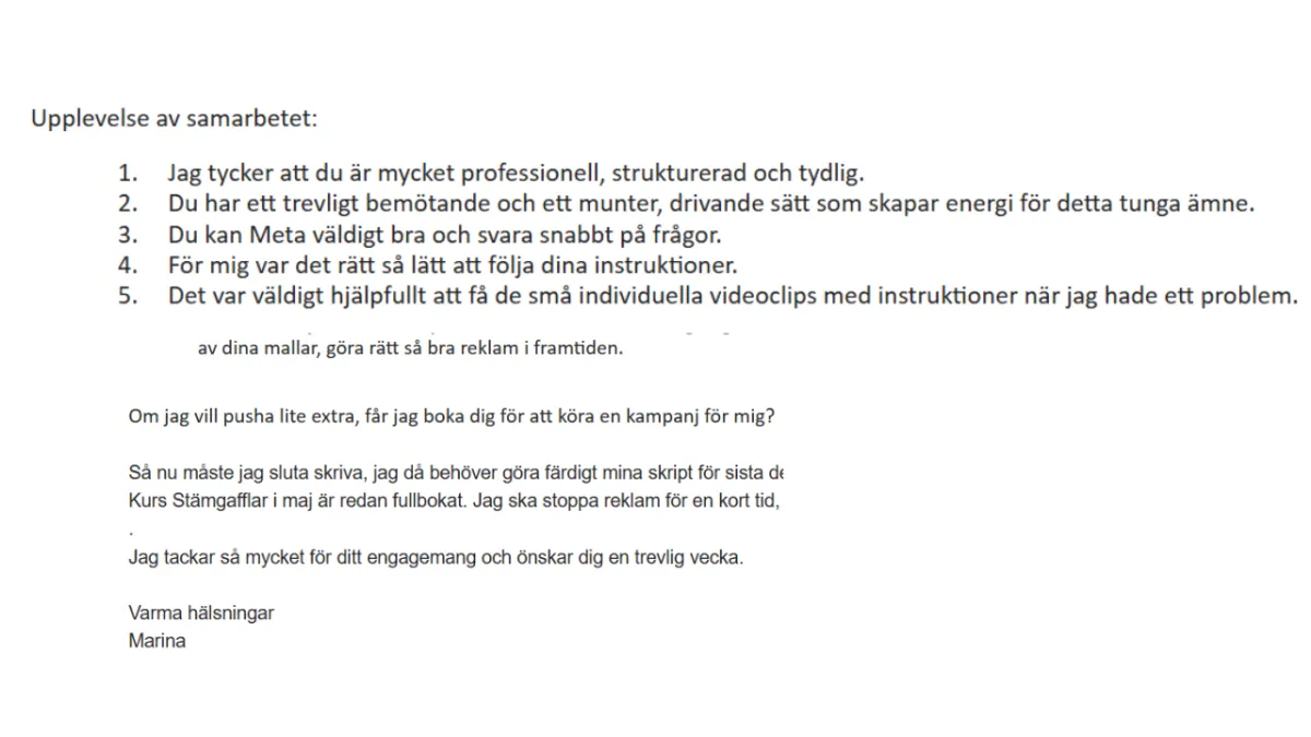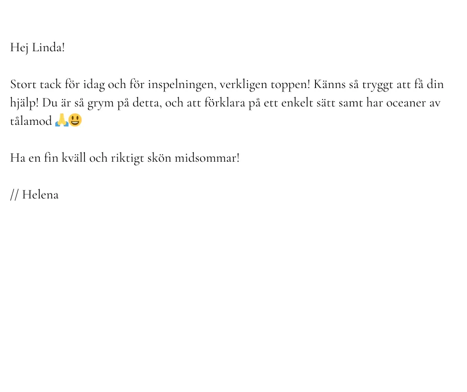 "Jag köpte kickstartpaketet av Linda då jag är nystartad och ville förstå grunderna plus behövde verkligen den där sparken att komma igång. Det var smidigt, inspirerande och väldigt pedagogiskt. Annonskursen var så himla bra att kunna återvända till eftersom man glömmer. Även inspelningen har jag tittat mycket på. Det absolut bästa med Linda är hennes personliga engagemang och pedagogiska, tydliga sätt."