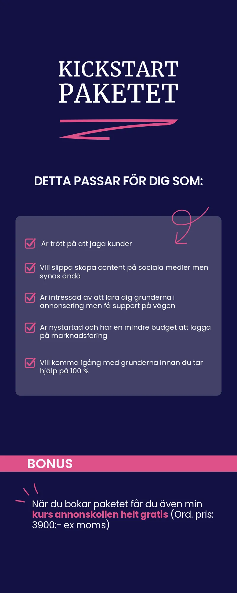 I kickstart kickstartar vi helt enkelt genom att förbereda allt och sätta upp dina första annonskampanjer i Meta tillsammans.🚀 Så att du kan börja nå ut och bygga varumärke, annonsera din freebie eller annonsera för leads/köp. Sedan är allt förberett och klart och du kan låta annonserna jobba för dig medan du gör det du tycker är kul i din business.
