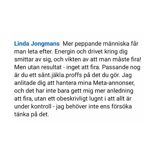 "Jag uppskattar verkligen att jobba med Linda! Hon är en riktig "doer" som både kommer med egna förslag och lyssnar in kundens behov. Kan varmt rekommendera Linda om du har behov att ta dig fram i Meta ads djungeln".