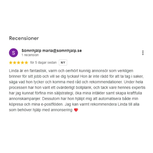 Utöver själva annonserna är hon ett stöttande och energigivande bollplank när de kommer till allt som rör företagande. Jag rekommenderar starkt Linda för alla som söker en pålitlig och effektiv marknadsföringspartner."