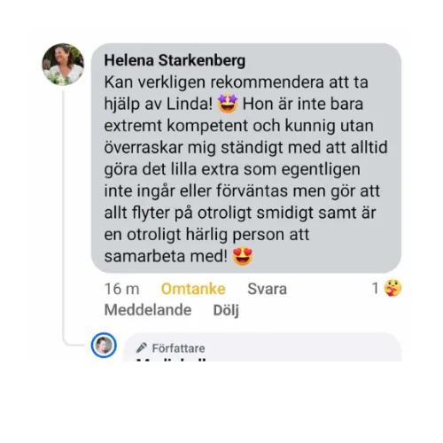 "Jag kan varmt rekommendera att ta hjälp av Linda! 😊 Redan från start kände jag att hon hade full förståelse för min vision och vart jag är på väg. Det märks verkligen att hon brinner för sitt jobb – hon är engagerad, lyhörd och en fantastisk bollplank för alla möjliga frågor. Med Linda vid sin sida känner man sig trygg. Hon hjälper till att strukturera upp tankar och arbete så att man vet exakt vad man ska fokusera på. Otroligt nöjd!"