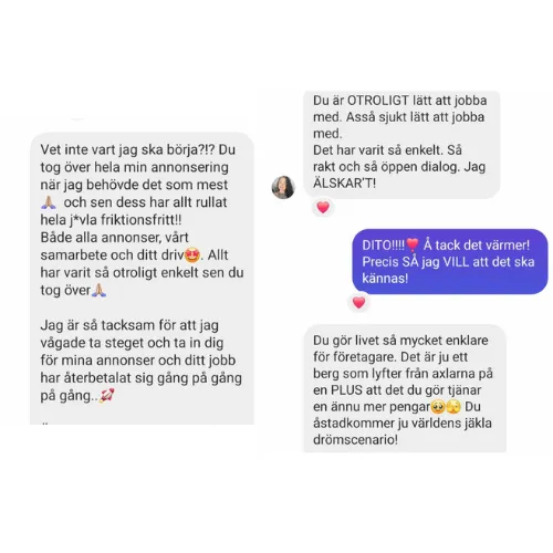 "Mitt samarbete med Linda har besparat mig otroligt mycket frustration och irritation. Hade jag inte anlitat henne hade jag inte fått koll på annonser och meta lika fort och hade inte ökat min epostlista med 800 pers på typ 3 månader. Hon är stöttande, svarar fort och kommer med tips och råd jag inte kommit på själv".