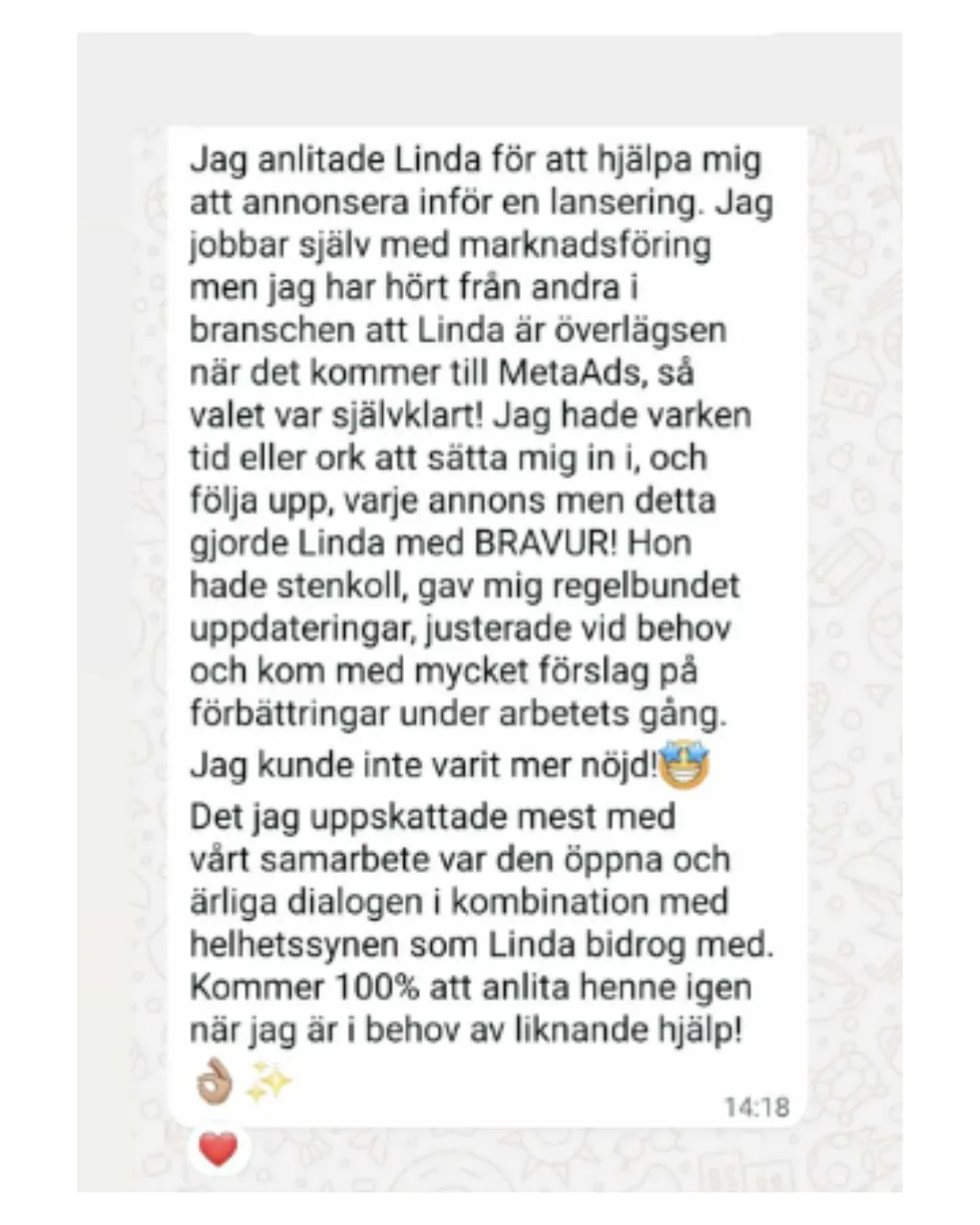 "Jag har tidigare försökt förstå mig på Meta och är så glad att jag vågade anlita professionell hjälp, det är så värt det!🙏"